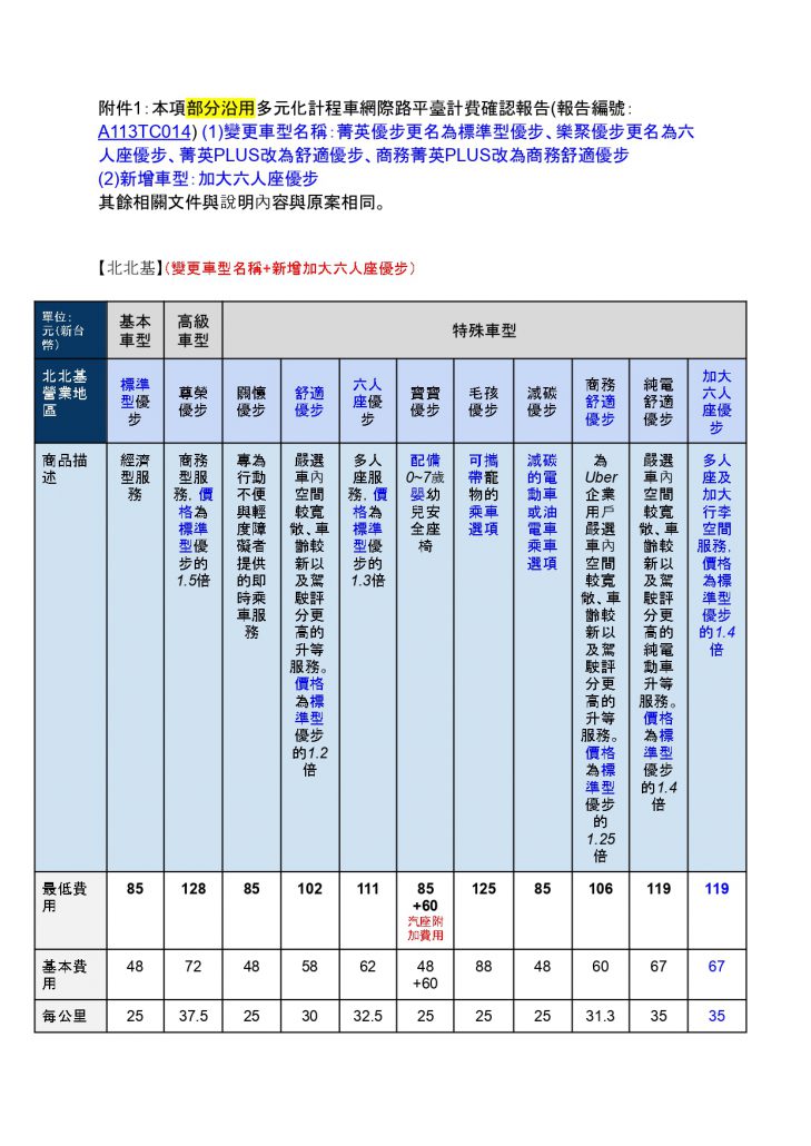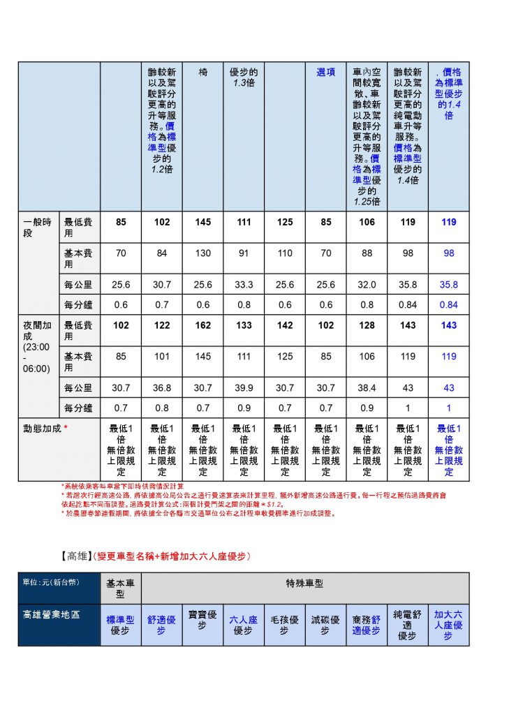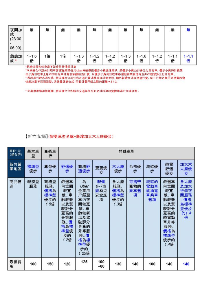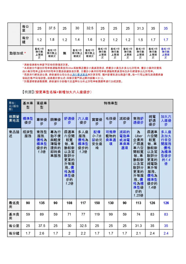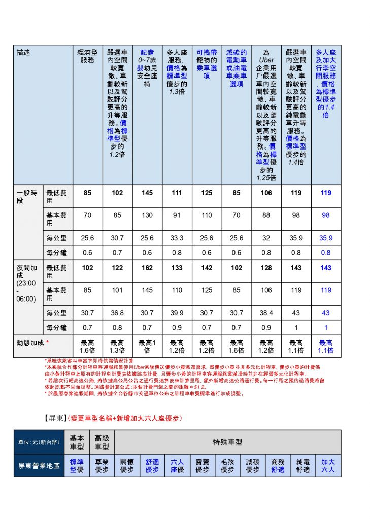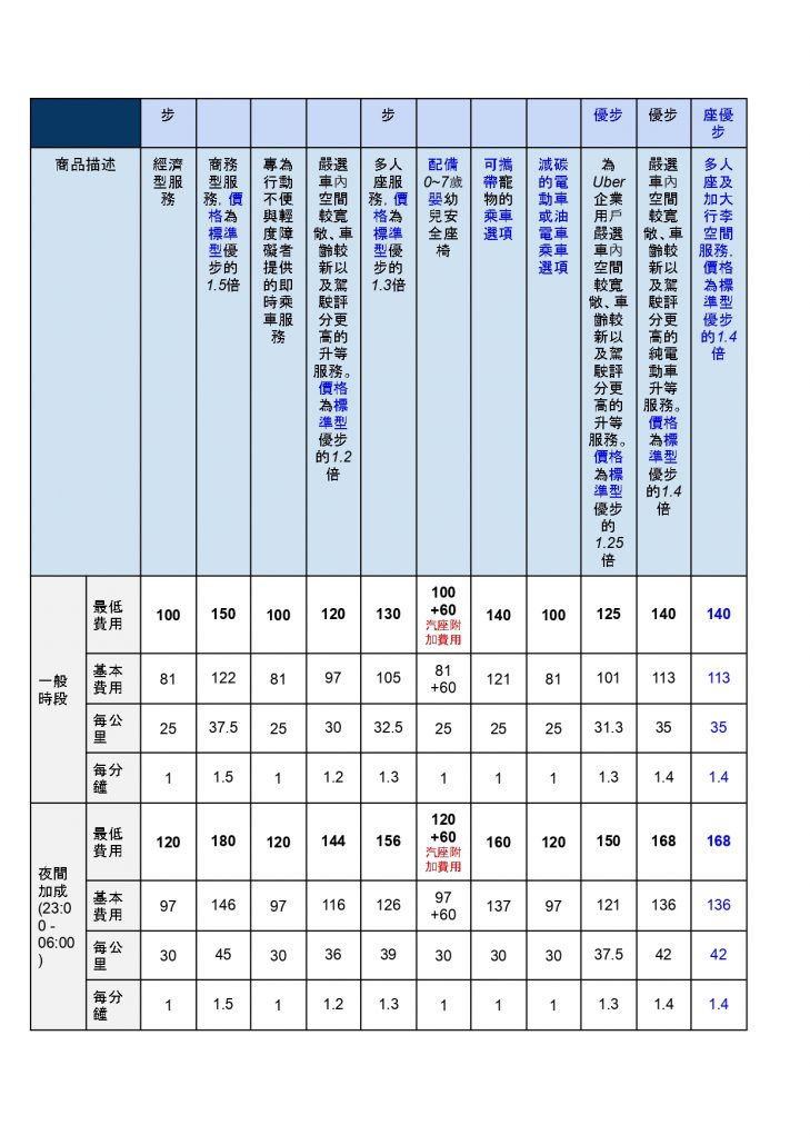 (1) 本公司遵循政府規定規劃費率,並以該費率作為您每次叫車時顯示之應付車資 之計算基礎,若費率表有變更,本公司會委託 Uber App 公布相關變更及將之刊載於 本公司之網際網路平台首頁。