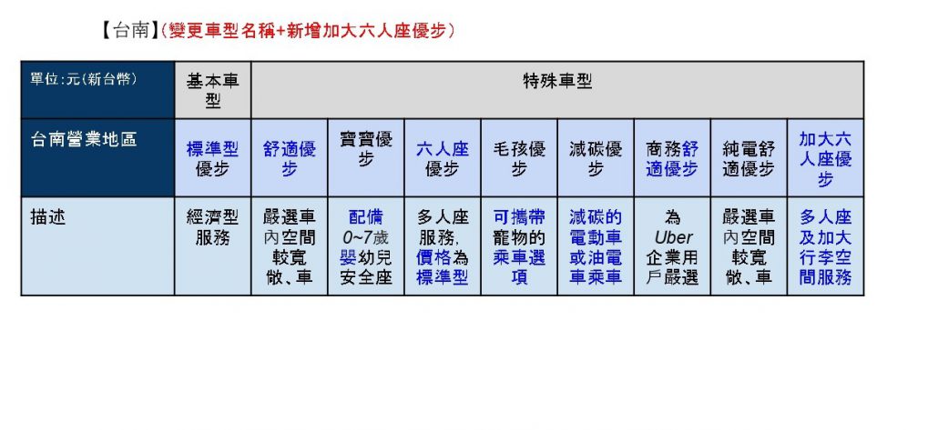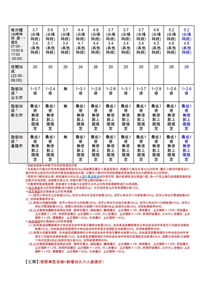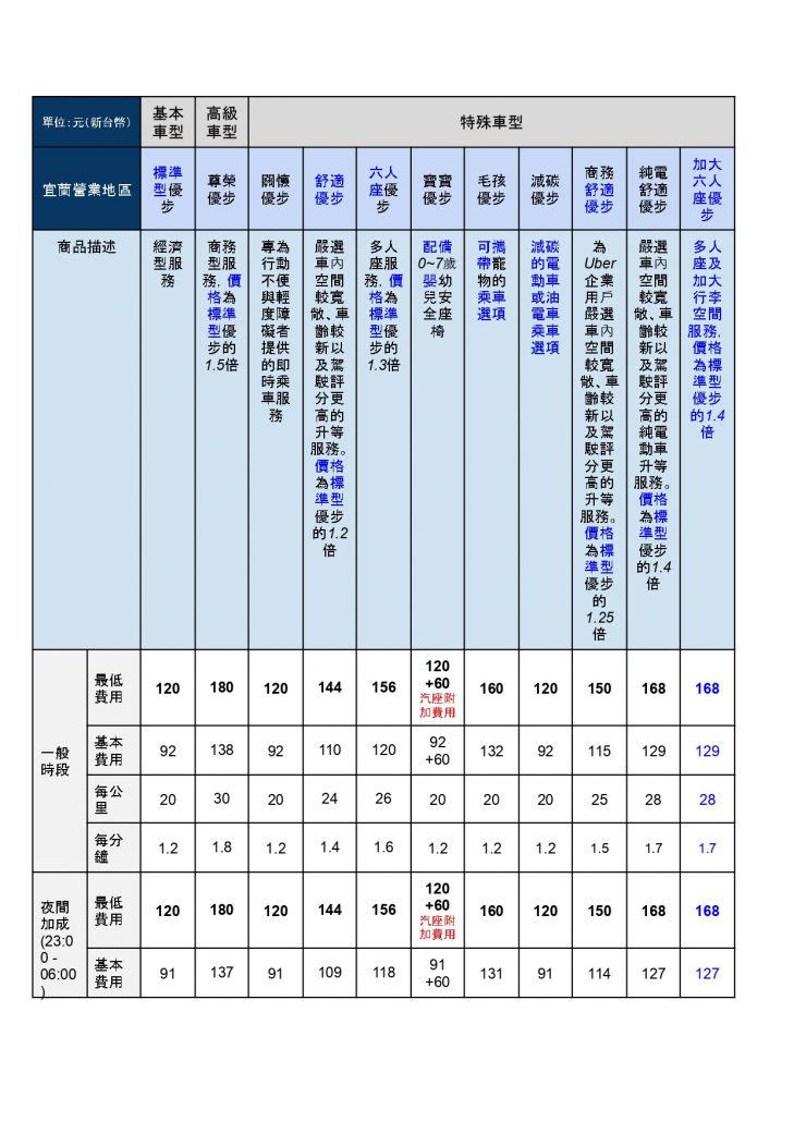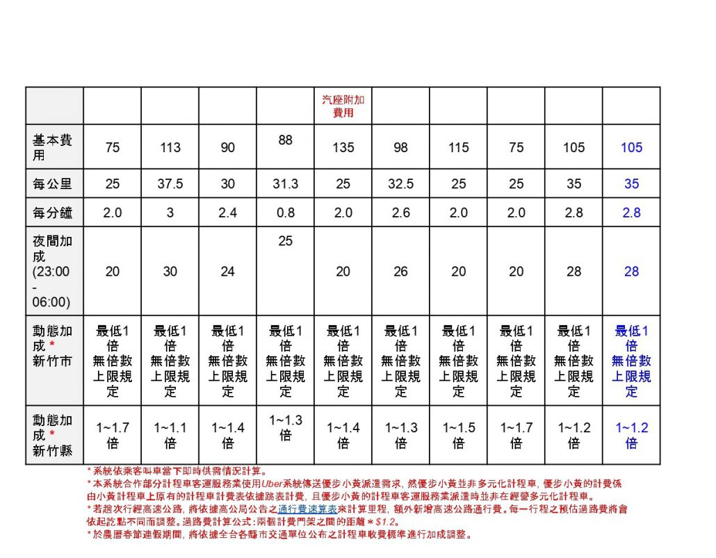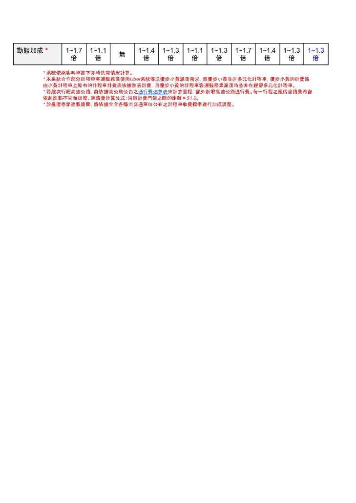 乘客使用 Uber 網際網路系統接受多元化計程車隊之派遣服務,此搭乘服務採用即時報價事先提供行程的應付車資。在乘客請求多元化計程車車隊派遣計程車時,系統會依預估的行程總時間、里程、尖(離)峰等多樣性費率因子,並以公路主管機關核定計費結構及不低於一般計程車運價之原則預估一筆應付車資,並於行程開始前事先提供給乘客,待乘客於系統確認同意此預估應付車資後,才由車隊派遣車輛及職業駕駛。預估應付車資的計算方式符合各地方政府規範之多元計程車運價範圍並經認可,詳細可參照各營運區域計費表(下方圖示)。