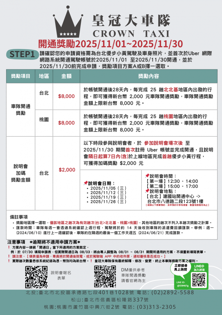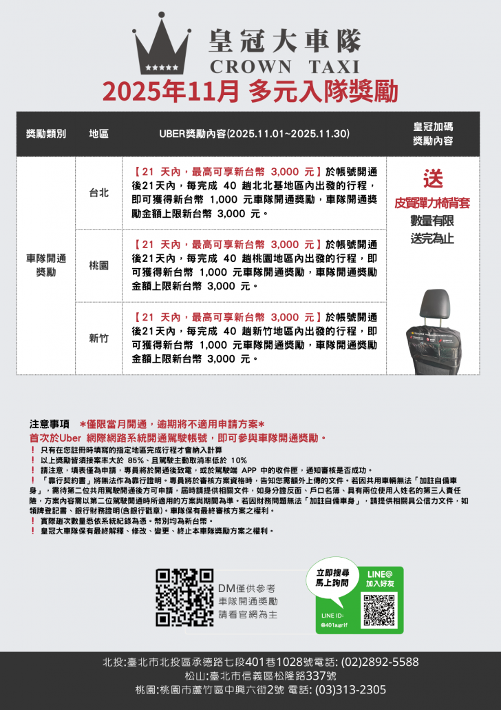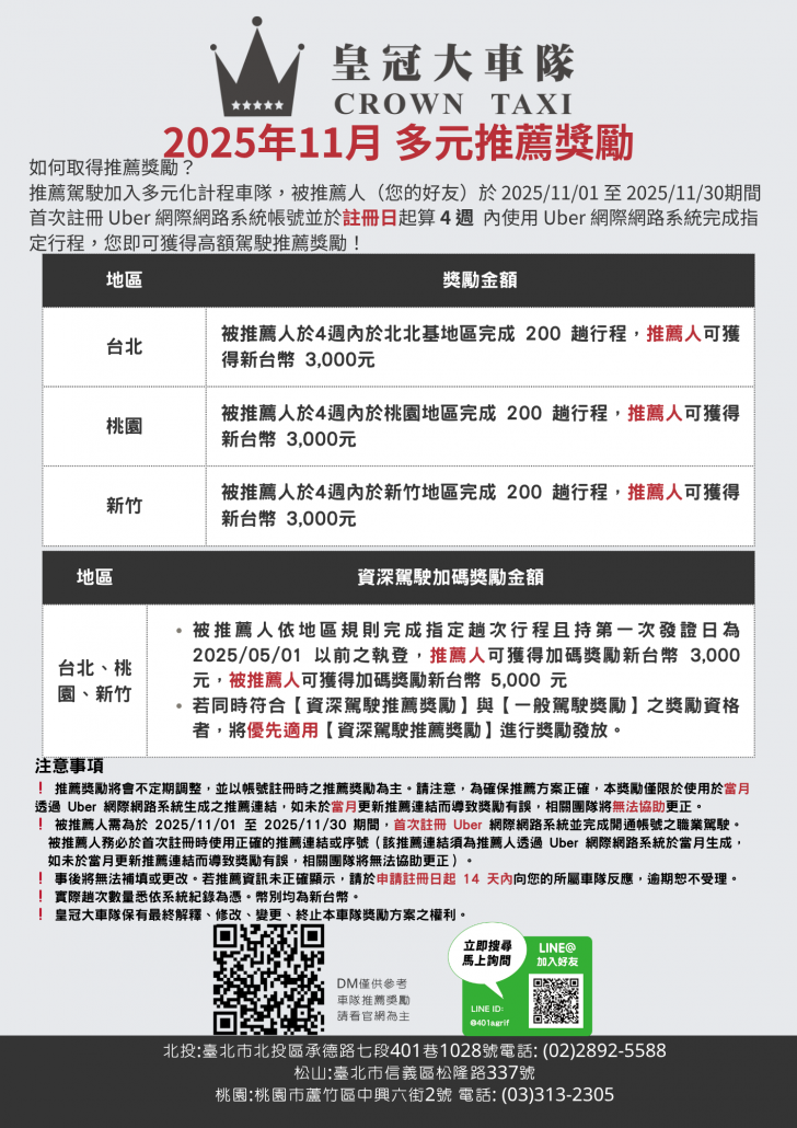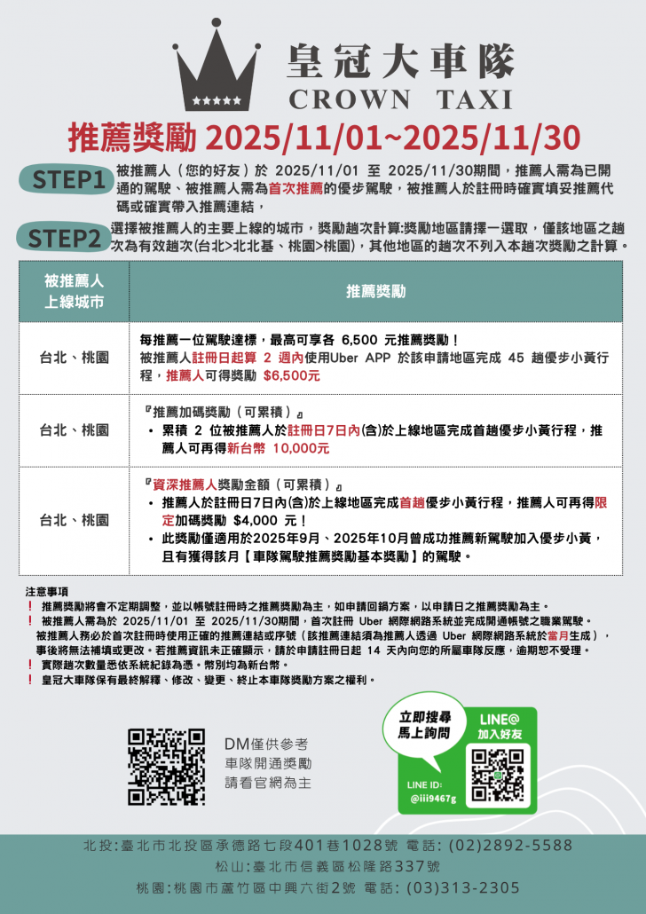 【114年11月】皇冠大車隊-台北/桃園小黃計程車推薦獎勵
