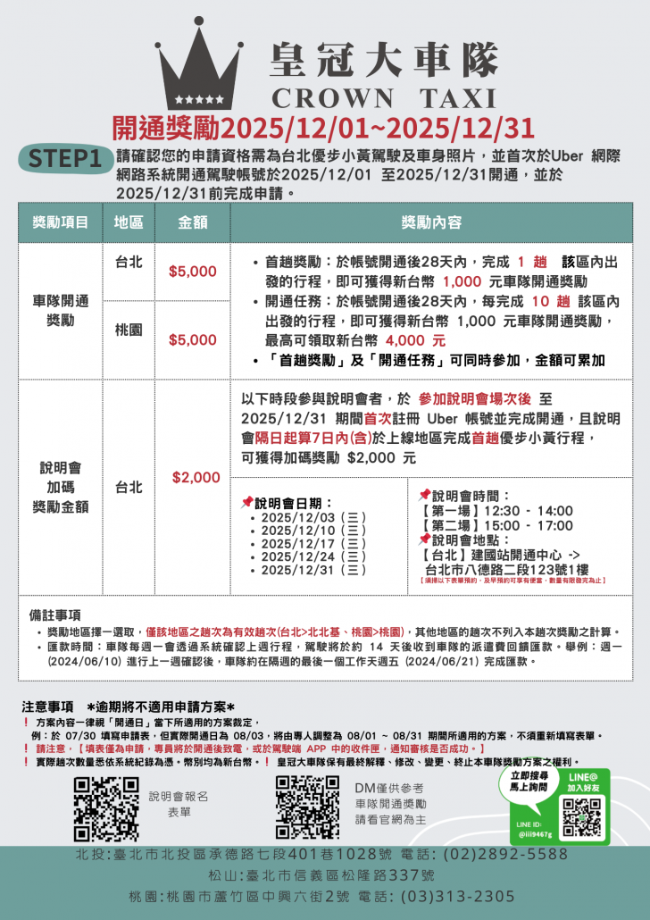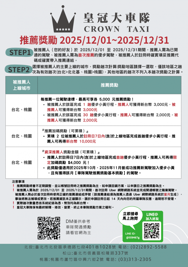 【114年12月】皇冠大車隊-台北/桃園小黃計程車推薦獎勵