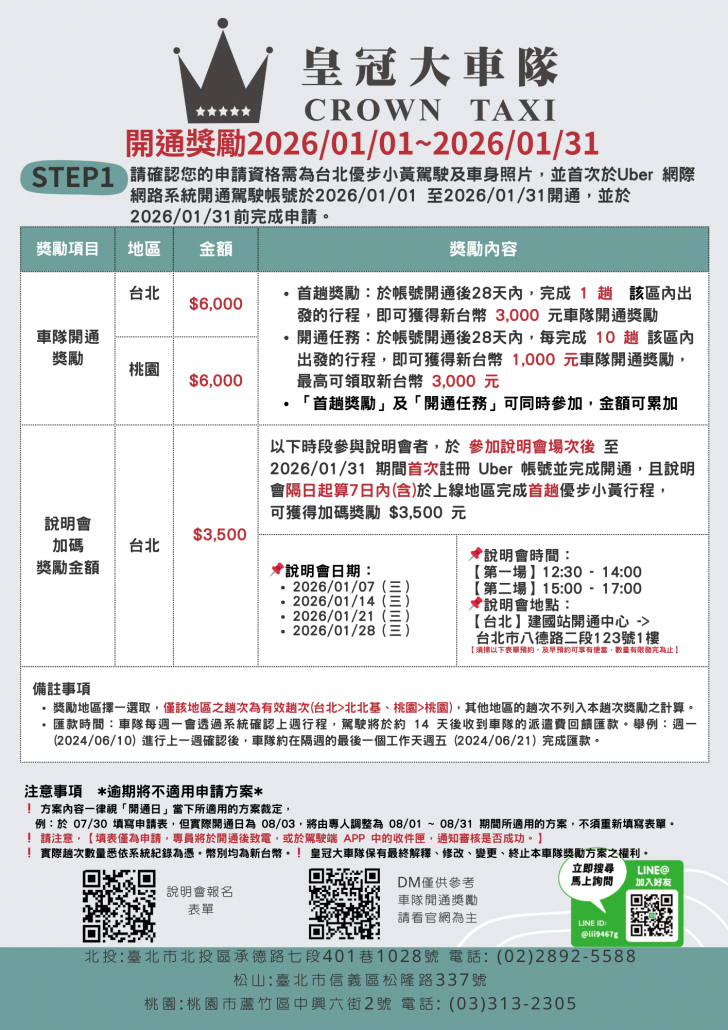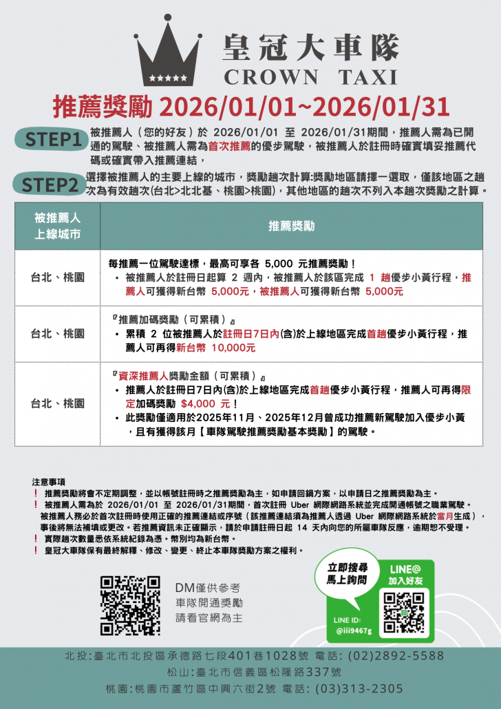 【114年12月】皇冠大車隊-台北/桃園小黃計程車推薦獎勵